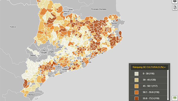 En el caso de los servicios culturales, la distribución no queda tan focalizada en el norte, sino que se extiende por gran parte del territorio. Esto es así porque los indicadores utilizados para evaluar estos servicios están ligados a la demanda que proviene de los núcleos de población. Por ello zonas de alrededor de Barcelona o áreas cercanas a los Puertos de Tortosa-Beceite tienen valores altos de este servicio, aunque la Garrotxa es la zona que obtiene en conjunto un valor más alto. Este es un servicio establecido a partir de indicadores relevantes desde un punto de vista turístico, como el número de plazas de turismo rural disponibles por hectárea, la proporción de bosque incluida en la Red Natura 2000, o el número de observaciones de animales, entre otros.