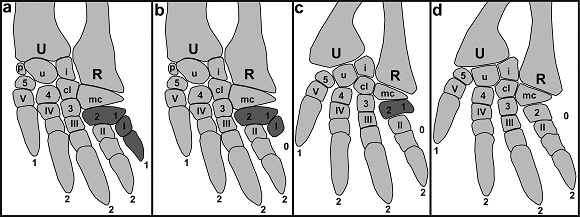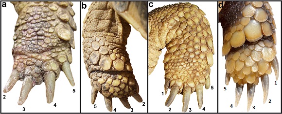 Adicionalmente, Albert Bertolero, especialista del grupo de quelonios de la International Union for Conservation of Nature, explica que "si se observan las radiografías de diferentes tortugas se confirma que los ejemplares con sólo cuatro dedos han perdido los huesos de las falanges, metacarpianos y carpianos del primer dedo. Esto ratifica que la pérdida del dedo es anatómicamente real y no sólo una apariencia externa".